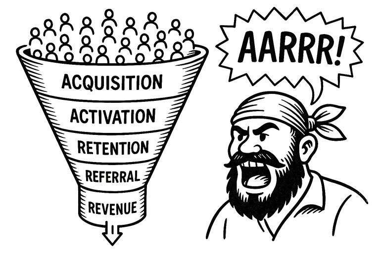 De AARRR (‘Pirate’) Funnel is een framework uit de startupwereld dat gebruikt wordt om klantgedrag te analyseren en te optimaliseren. De naam is een knipoog naar de piratenschreeuw (“AARRR!”) en staat voor vijf opeenvolgende fases: Acquisition, Activation, Retention, Referral en Revenue.