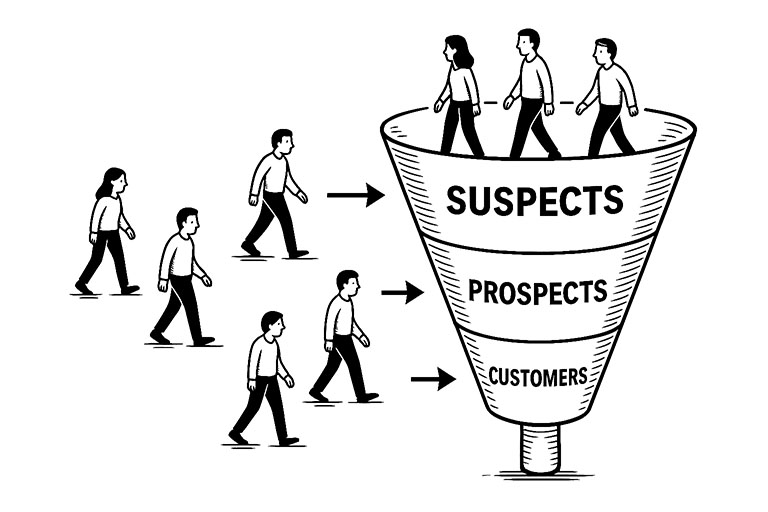 Het begint bij suspects—personen die nog geen contact hebben gehad met je merk—en loopt via prospects naar daadwerkelijke klanten.